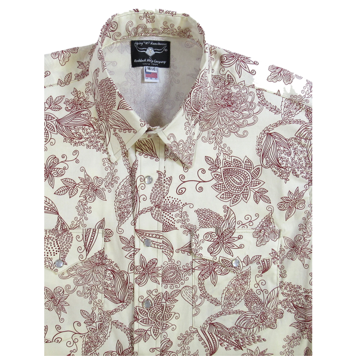 Peak comfort and cool are found in this tropical print. The Sangria Floral hits all the right notes with a striking deep red monotone print against a natural ground in a light cool fabric that drapes like silk. Western cut with snaps and two flapped pockets. Available up to 3XL and Made in USA. 100% cotton and ready to party!