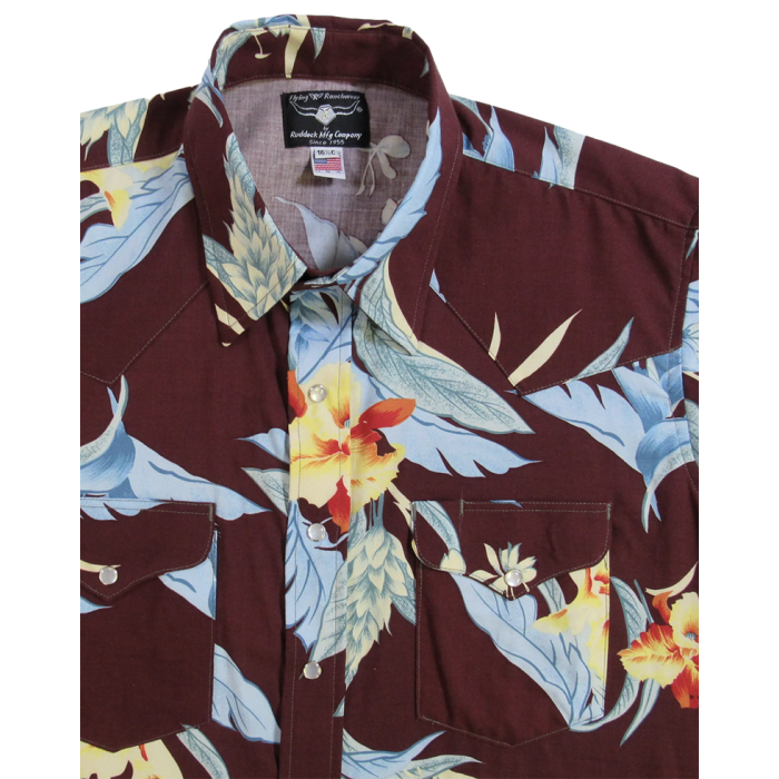 This Floral Print has a striking contrast of mahogany red with light blue and soft yellow print accents in a light fabric that feels cool and wears like silk. Western cut with snaps and two flapped pockets. Available up to 3XL and Made in USA. 100% cotton!
