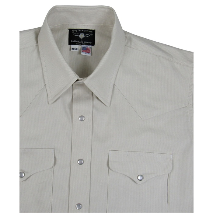 Over the years, we've taken top drawer dress shirt fabrics and made them into some of the finest western dress shirts around. This tan chalk stripe falls right into that category. We start with a high thread count chalk stripe and add matched yokes in front and back and top it off with snaps. See why Made in USA is superior.