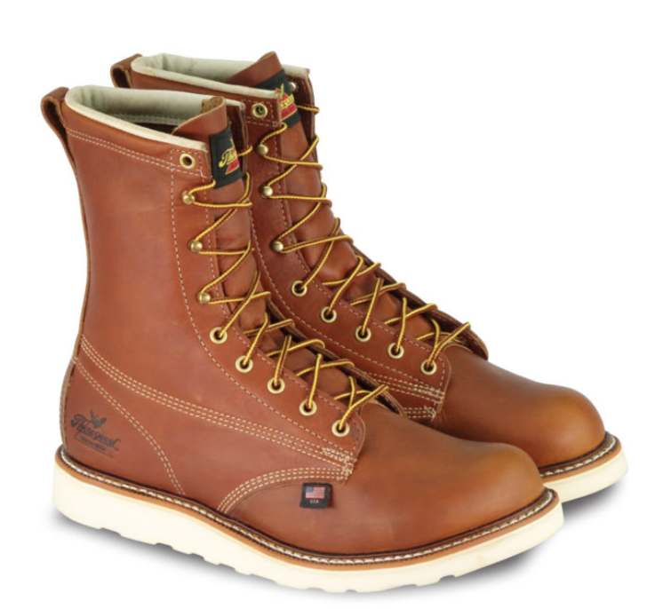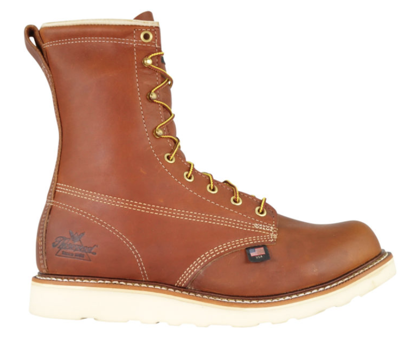 American Heritage Wedge Sole Boot This Thorogood 814-4364 8-inch plain toe boot is strong on the outside and shock-absorbing on the inside. The MAXWear Wedge outsole means your feet can take the full weight of your body without complaint while wearing this American Heritage Thorogood plain toe boot all day long so you can focus on the job at hand.