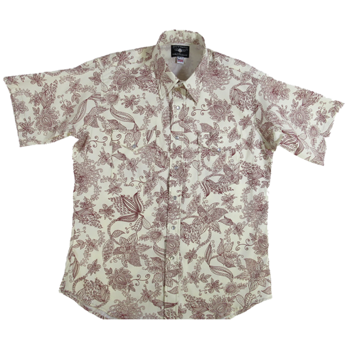 Peak comfort and cool are found in this tropical print. The Sangria Floral hits all the right notes with a striking deep red monotone print against a natural ground in a light cool fabric that drapes like silk. Western cut with snaps and two flapped pockets. Available up to 3XL and Made in USA. 100% cotton and ready to party!