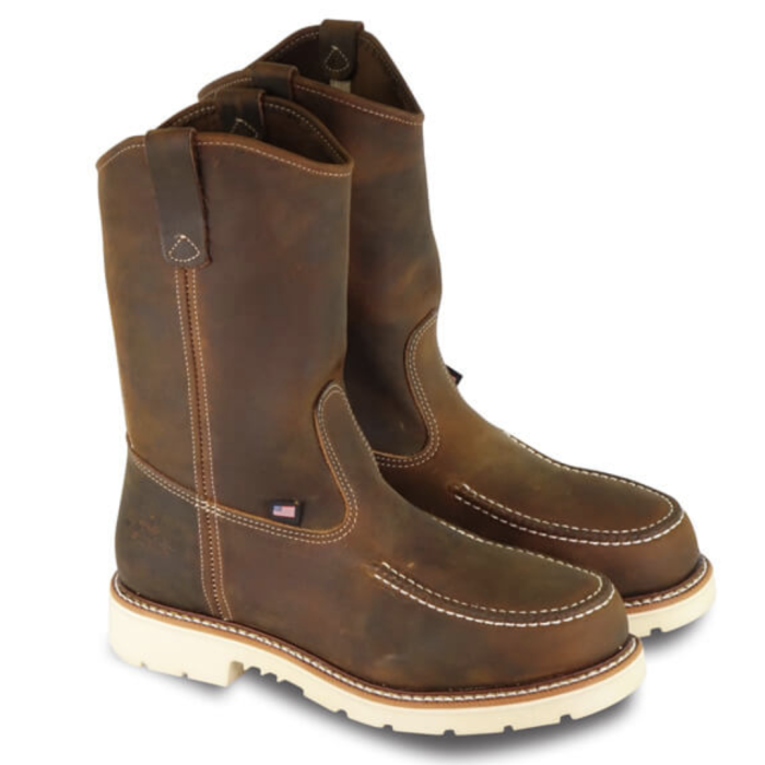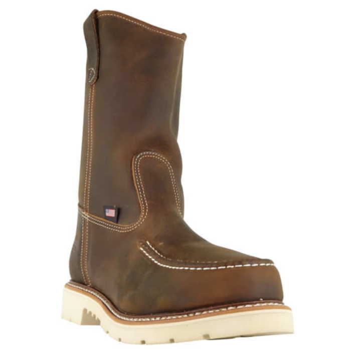 You’ve found the ultimate in comfort, support, and protection in our American Heritage 11″ Trail Crazyhorse safety toe moc toe pull-on Wellington work boots. These slip-on steel toe boots go on easily, taking away a little of the stress and strain in your life. Plus, with no laces on the high composite shank, full-grain leather, and Goodyear welt construction, there’s less risk of moisture getting into your boots. Inside, we’ve combined our cushioned insole and shock-absorbing footbed to give you the comfort you need to keep going all day long. And your feet stay planted firmly on the ground with the MAXWear 90™ outsole.