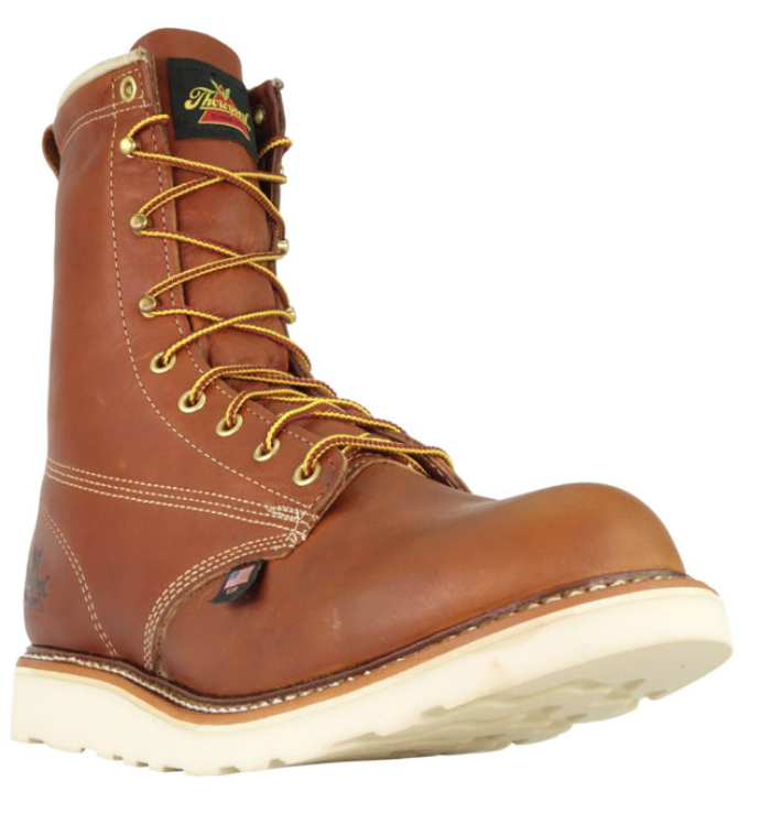 American Heritage Wedge Sole Boot This Thorogood 814-4364 8-inch plain toe boot is strong on the outside and shock-absorbing on the inside. The MAXWear Wedge outsole means your feet can take the full weight of your body without complaint while wearing this American Heritage Thorogood plain toe boot all day long so you can focus on the job at hand.